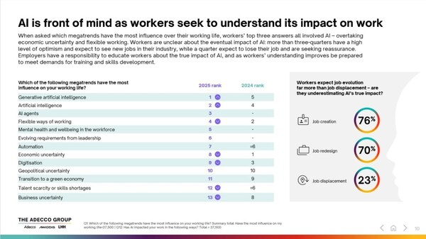 上海2025年11月20日 /美通社/ — 近日,全球领先人力资源咨询与解决方案提供商德科集团(The Adecco Group)(瑞士证券交易所代码:ADEN)发布第六份《未来全球劳动力报告》,报告主题为 “职场人:如何在人工智能时代茁壮成长”(Humanity at Work: How to thrive in the AI era)。该报告深入剖析人工智能、工作使命感与人际联结对职场形态的重塑作用,并针对劳动力转型背景下,企业管理者应采取何种策略跟上变革节奏给出方向。基于对 31 个国家、21 个行业共 37,500 名职场人士的调研,报告指出,随着人工智能工具(AI tools) 及AI 智能体(AI agents)的快速发展,受访者表示每日平均可节省 2 小时工作时间。但值得注意的是,这种对生产效率提升的认知,与众多企业实际体验存在差异,折射出两者间的脱节问题。