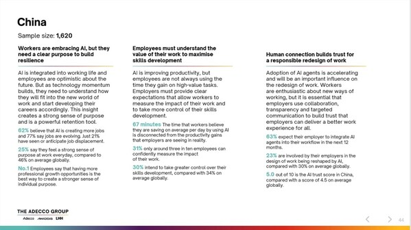 - AI 时间节省感知与实际产出存差:中国员工认为利用 AI 平均每天可节省 67 分钟,但雇主实际看到的生产力提升并不相符;且仅约 1/3 的员工能自信地衡量自己的工作成效,反映出企业需完善员工技能发展与工作价值衡量体系。