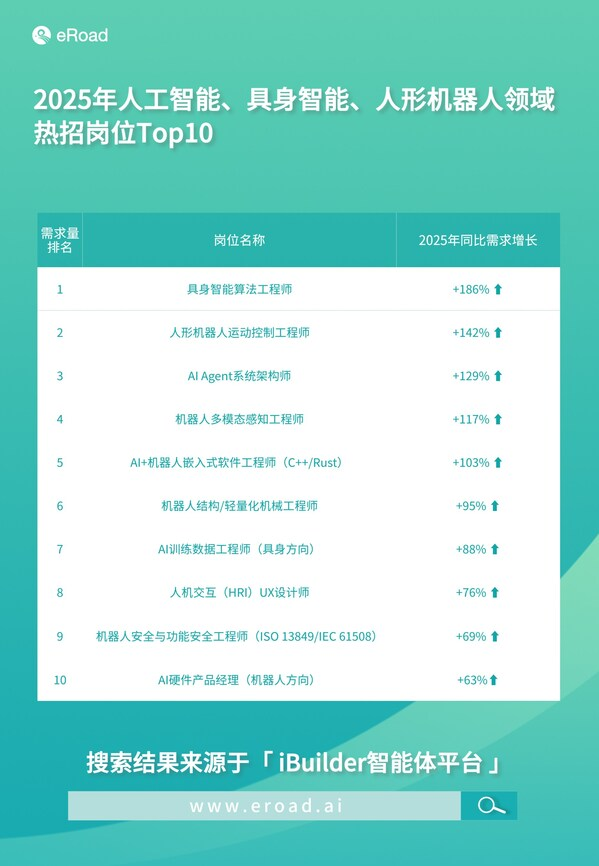根据eRoad薪酬数据显示,2025年人工智能+、具身智能、人形机器人领域的Top10热招岗位中,尤以具身智能算法工程师、人形机器人运动控制工程师、AI Agent系统架构师同比需求增长突出,分别达186%、142%、129%,同时在需求方类型上各有不同。