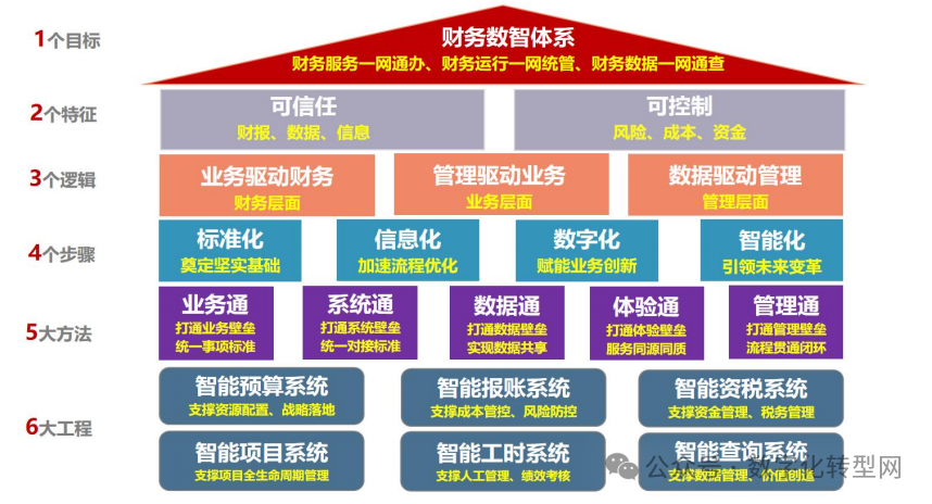 在工作目标方面,我们称财务数智体系蓝图为“123456”即1个目标、2个特征、3个逻辑、4个步骤、5大方法、6大工程,即以构建“三个一网的财务数智体系”为目标,以“可信任、可控制”为特征,以“业务驱动财务、管理驱动业务、数据驱动管理”为逻辑,以“标准化、信息化、数字化、智能化”为步骤,遵循“业务通、系统通、数据通、体验统、管理通”的方法,落实“智能预算系统、智能报账系统、智能资税系统、智能项目系统、智能工时系统、智能查询系统”重点工程,构建以“数字化运营承载、精益管管理赋能、全周期项目管理”为核心的财务数智体系,推动实现“财务服务一网通办、财务运行一网统管、财务数据一网通查”。