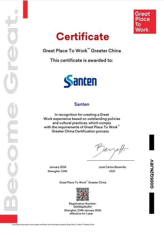 上海2026年2月12日 /美通社/ — 近日,全球眼科领域的领导企业参天公司在包括大中华区在内的全球21个区域荣获Great Place To Work™(卓越职场™)认证。