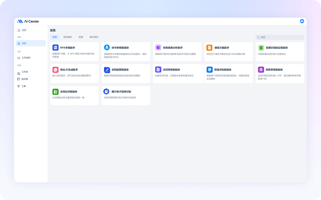 作为本次升级的核心模块,AI Center实现了智能体与业务流程的全自定义适配,技术能力覆盖零代码和低代码双模式智能体构建。
