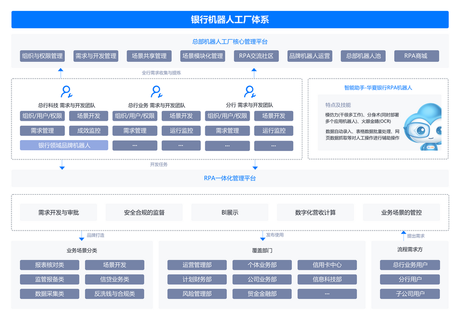 艺赛旗与华夏银行密切合作,共同构筑以总部为管理核心的全行机器人工厂体系,并基于信创系统建设“一个工厂、多个租户”模式,旨在满足快速部署、灵活应用的业务需求。