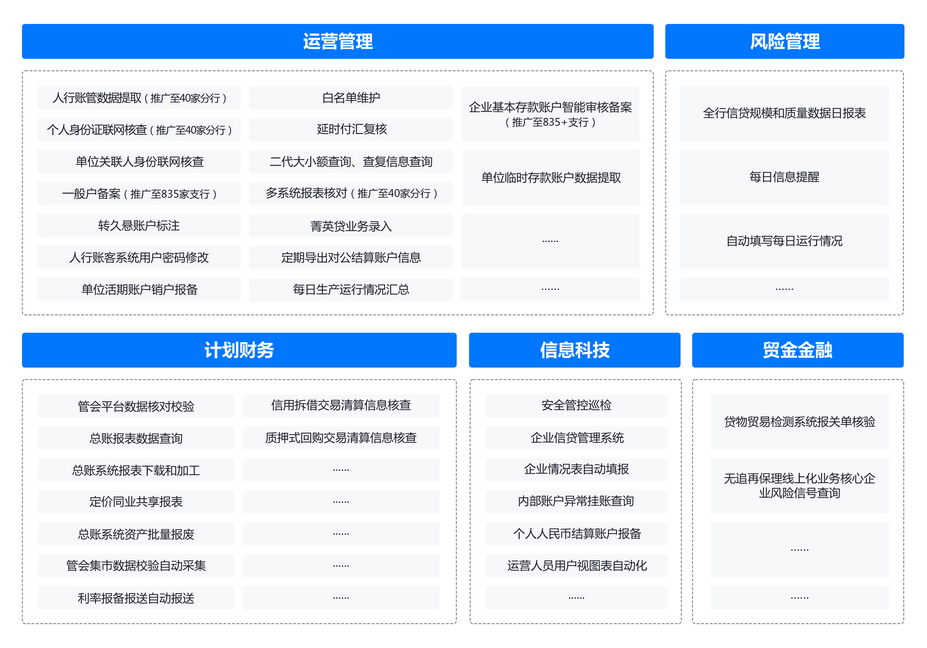 进一步深化总分统筹模式的管理体系,建立集中管控平台,完善RPA资源配置,应用覆盖超过40家分行,全年新增超过200个自动化场景,应用RPA机器人超过100个