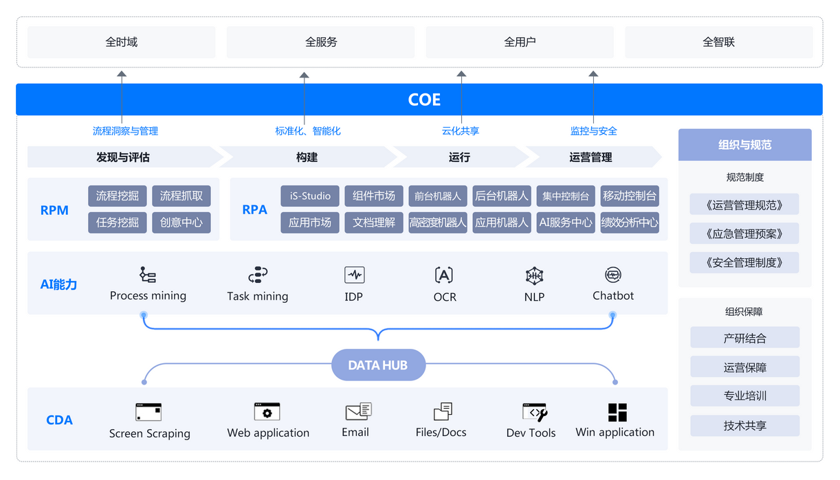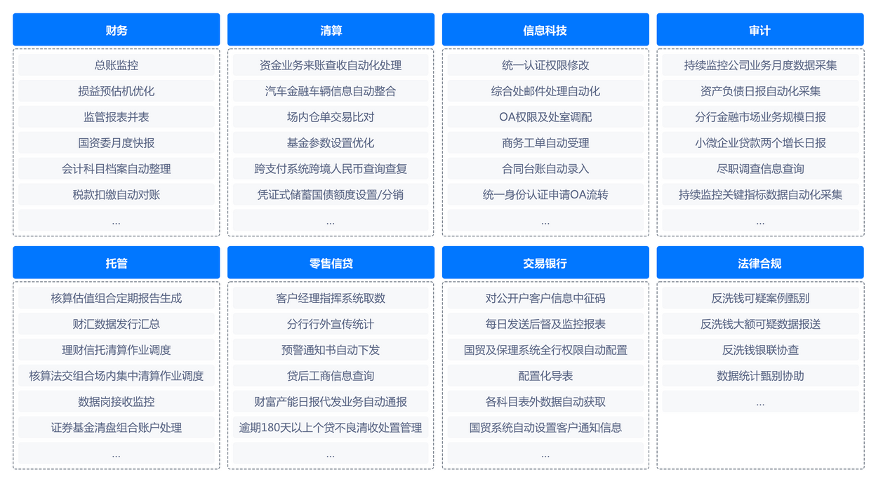 全面深化总分统筹、应用上云,在总行运营管理部等持续试点验证流程挖掘技术应用成效,为在全局建设“发现、评谷估构建、运 行营”的“RPM+RPA+AI”的超自动化平台开启应用探索。