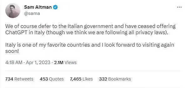 3月31日,意大利率先禁止使用ChatGPT,并限制OpenAI处理意大利的用户信息,理由是“为训练ChatGPT的算法而大量收集和存储个人数据没有法律依据”。