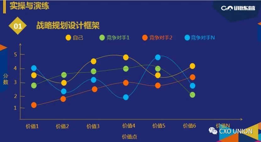 首先写出自己产品所提供的价值点,在每个价值点上对于自己和竞争对手进行打分,每一项的分值连成一条价值曲线,这样就可以清晰看到自己的优势在哪里,劣势在哪里,未来应该如何调整。