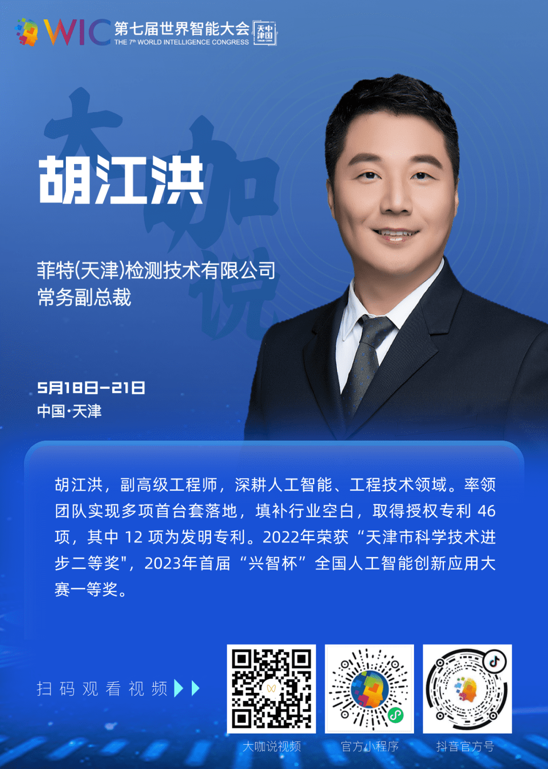 胡江洪,副高级工程师,深耕人工智能、工程技术领域。率领团队实现多项首台套落地,填补行业空白,取得授权专利 46项,其中 12 项为发明专利。2022年荣获“天津市科学技术进步二等奖”,2023年首届“兴智杯”全国人工智能创新应用大赛一等奖。