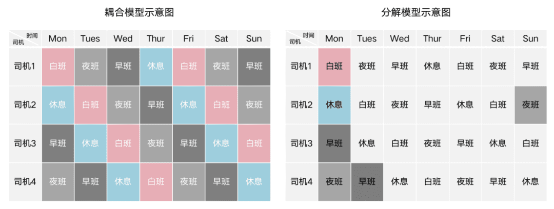 其中模型分解至关重要,以基于班制规则的日期分解为例,将周度模型分解为七个日度模型,并考虑连续日期间的耦合约束,通过分解极大提升求解效率。假设乘务团队采用四班三运转班制,则每位司机的任务以“白班-夜班-早班-休息”的周期循环往复,如图(耦合模型示意图)所示。直接基于该模型进行可行性验证或均衡性调整非常困难,所以将其分解为多个日度模型。如图(分解模型示意图)所示,只考虑周一的任务,并且考虑周日和周二的”夜班-早班”耦合约束,有效降低了问题规模。类似的模型分解在实际求解过程中不一而足。