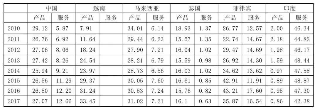 数字技术加速了全球分工格局变化,得益于发达国家制造业外迁和数字经济产业的发展,ICT产品制造业成为以中国、越南、马来西亚等为代表的东亚、东南亚发展中国家融入全球价值链的重要机遇。表1显示了中国等几个重要亚洲国家在ICT产品和服务出口的占比情况,可以看到中国、越南、马来西亚、菲律宾的ICT产品出口占据了这些国家所有产品出口中的相当大份额。而印度、菲律宾也可以通过承接发达国家的软件外包业务,融入到世界数字经济的分工中。