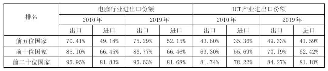 伴随着数字产业发展带动的生产能力和配套产业链的完善,加上数字技术进步带来的生产要素比重变化,全球价值链“近岸化”“短链化”正逐步成为可能[32]。以电脑(HS8471)的出口为例,2010年,中国和墨西哥的出口占世界比重分别为78.67%和8.21%;2019年中国和墨西哥的出口份额就分别变为78.36%和18.21%。这意味着墨西哥承接了很多电脑生产和配套的工作,而墨西哥直接与当年进口最多电脑份额的美国接壤(进口占比27.87%),体现出“近岸化”。从电脑出口国家的集中度来看,2010年出口前五位国家占据了70.41%的份额,2019年增长到75.29%;而前二十位出口国家的份额则占据了该产业95%的比重。进口份额中,前五位的国家2010年所占份额为49.18%,2019年为52.15%;前二十位的国家进口份额从2010年的81.83%略微下降为81.68%。服务业中的ICT产业的进出口份额集中度也出现了同样的现象,但集中程度上较电脑行业略低(见表2)。这说明在数字经济相关的制造业和服务业中,生产和进口是围绕前几位核心国家进行,主要是美国、中国、德国[33]。
