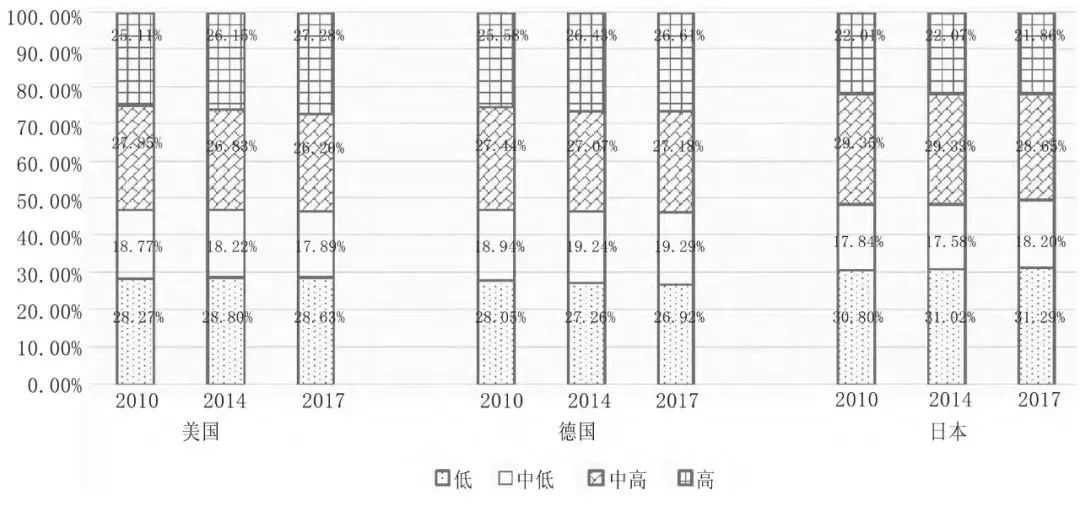 从数字密集度来看,在发达国家内部,2010年至2017年用数字密集度分类的经济结构几乎没有特别明显的变化(见图3)。根据OECD对产业数字密集度的分类,大部分制造业属于中高数字密集型,制造业占比较低的美国在这一类别有轻微的下降,但是并不显著;与日本相比,美国、德国的高、中高数字密集度产业的占比之和要略高一些。一是说明这些国家近年来的产业结构较为稳定;二是说明现行分类标准下行业的数字密集度并没有出现结构性改变。实践中,发达国家因较高的人力成本,其本国制造业的自动化水平一直较高,虽然不断推出“数字化工厂”“无人工厂”等新的制造业模式,但大多用于附加值较高的行业(如汽车制造)或具有品牌溢价的制造业企业中,并没有改变整个行业的数字密集度。而制造业上下游产业联系复杂,中小企业众多,大企业的数字化转型经验难以完全复制到上下游的中小企业中,因此数字技术与实体经济融合的过程较为缓慢。