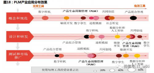PLM在主要通过与人工智能(AI)和机器学习(ML)两大领域结合而推动工业4.0的发展,其在设计和研发 方面应用最为广泛:智能互联产品的开发和管理方式正在改变PLM的实现途径,用户对于PLM的使用将不再 局限于管理层面,而是在此基础之上寻求产品/业务的优化与创新。;在AI和ML的先进企业中,61%已完全集 成的PLM系统,而未接触两者的企业中,PLM的应用比例仅为12%。