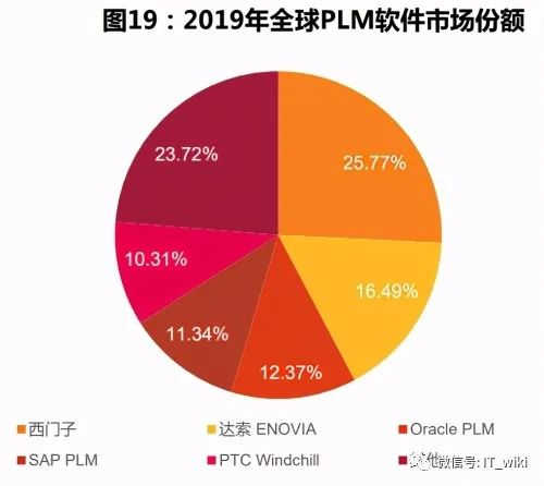在PLM的主流应用市场中,共有14,971家企业在使用PLM软件产品。西门子的 Teamcenter 和 达索系统的 ENOVIA软件最受青睐,分别在市场份额中占比25%和16%。提供PLM的专业公司包括达索系统、西门子、PTC 等;由于ERP与PLM都体现流程管理的思想,关系密切,一些ERP巨头如SAP、甲骨文、IFS也提供PLM软件。