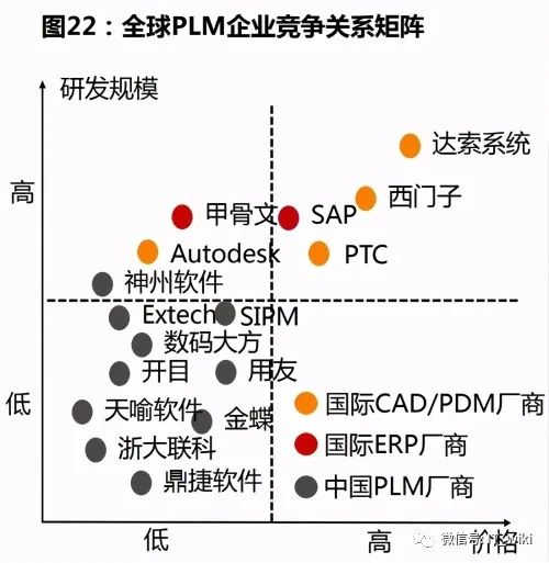 二者并无技术壁垒:相比CAD/PDM厂商,ERP厂商在资源管理与组织协同方面具有更强的竞争能力;PLM 供应商则多提供全面的研发技术组合,包括设计,仿真,产品数据管理和协作技术等。