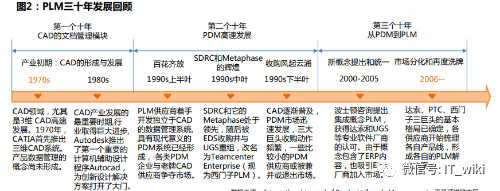 可能的原因是,一方面,PLM/PDM技术的发展与CAD的发展息息相关,正是CAD的大量应用,才使企业认识 到了产品数据管理的重要性;另一方面,根据PLM概念的发展历史,其是对CAD的集成延伸,因此CAD 厂商 进入PLM行业具有一定的技术与客户资源先决优势。
