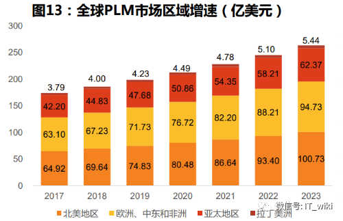 区域部署差异化,北美地区继续主导行业市场:来自北美和欧洲,中东和非洲地区的收入共同占PLM总市场收 入的73.7%,北美和西欧发达地区将持续为PLM软件供应商提供最多的商机。