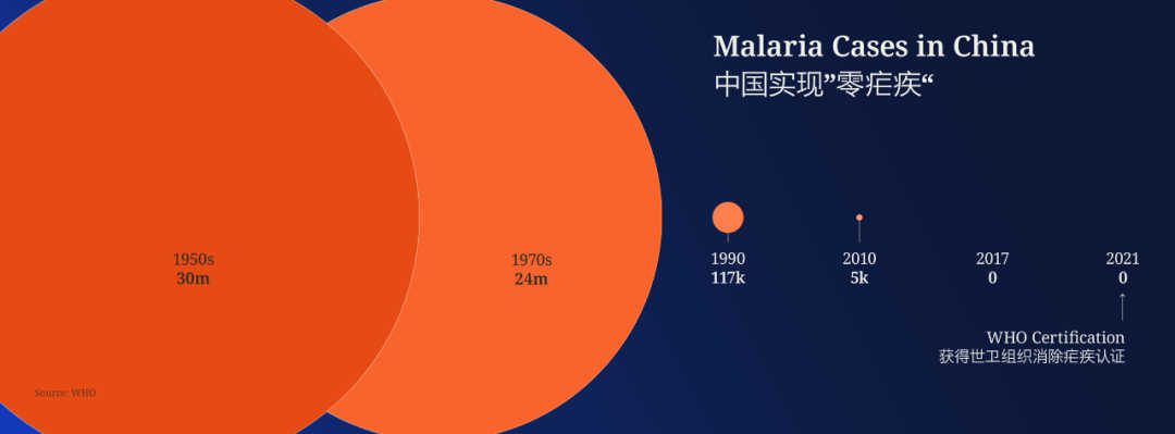 目前绝大多数疟疾病例都发生在非洲,但上世纪五十年代的情况并非如此。当时,中国每年至少有3000万疟疾病例,并有30多万人因此死亡。但是,得益于中国科学家取得的重大科研突破,中国的疟疾病例和死亡人数开始稳步下降。屠呦呦便是其中之一,她的开创性工作为世界带来了抗疟新药,如今仍然是全球治疗疟疾的主要药物。她本人也因此获得了诺贝尔奖。2010年,中国启动了《中国消除疟疾行动计划》。2017年,中国首次实现了零本土疟疾感染病例,并最终在2021年获得世界卫生组织颁发的无疟疾认证。