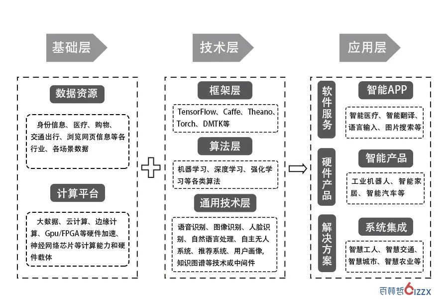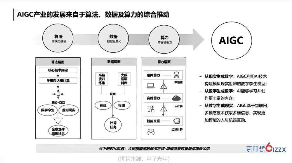 (图片源自:《算力时代》)AI产业布局在生活方方面面,如智能医疗、智能金融、智慧教育、智慧交通、智能家居、智能零售等,算力最为AI技术发展的保障,反过来促进算力的技术革新。AI模型和算法对分布式、分散式的需求,以及超大规模的复杂模型处理海量数据,都需要高性能计算机的并行计算做支撑。OpenAI数据显示,AI算力以每年10倍速度增长么,意味着2021年以来,大规模AI训练计算量呈指数级增长,远远快于芯片的摩尔定律。国际数据也公布,计算作为AI的关键,算力突破推动算法创新,也会促进第三次深度学习发展浪潮。随着AI边缘应用发展,工业、安防、物联网、多媒体、自动驾驶、移动互联等成熟落地,AI应用会从云端走向边缘,与此同时,量子计算也会是增强新能量的思路,融合公共算力服务、产业聚集以及生态建设,各个企业计算中心也会成为智能时代关键设施。算力发展为大数据提供了很强大的技术保障。