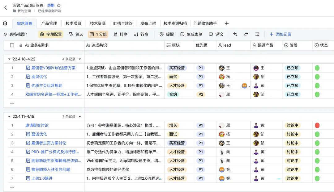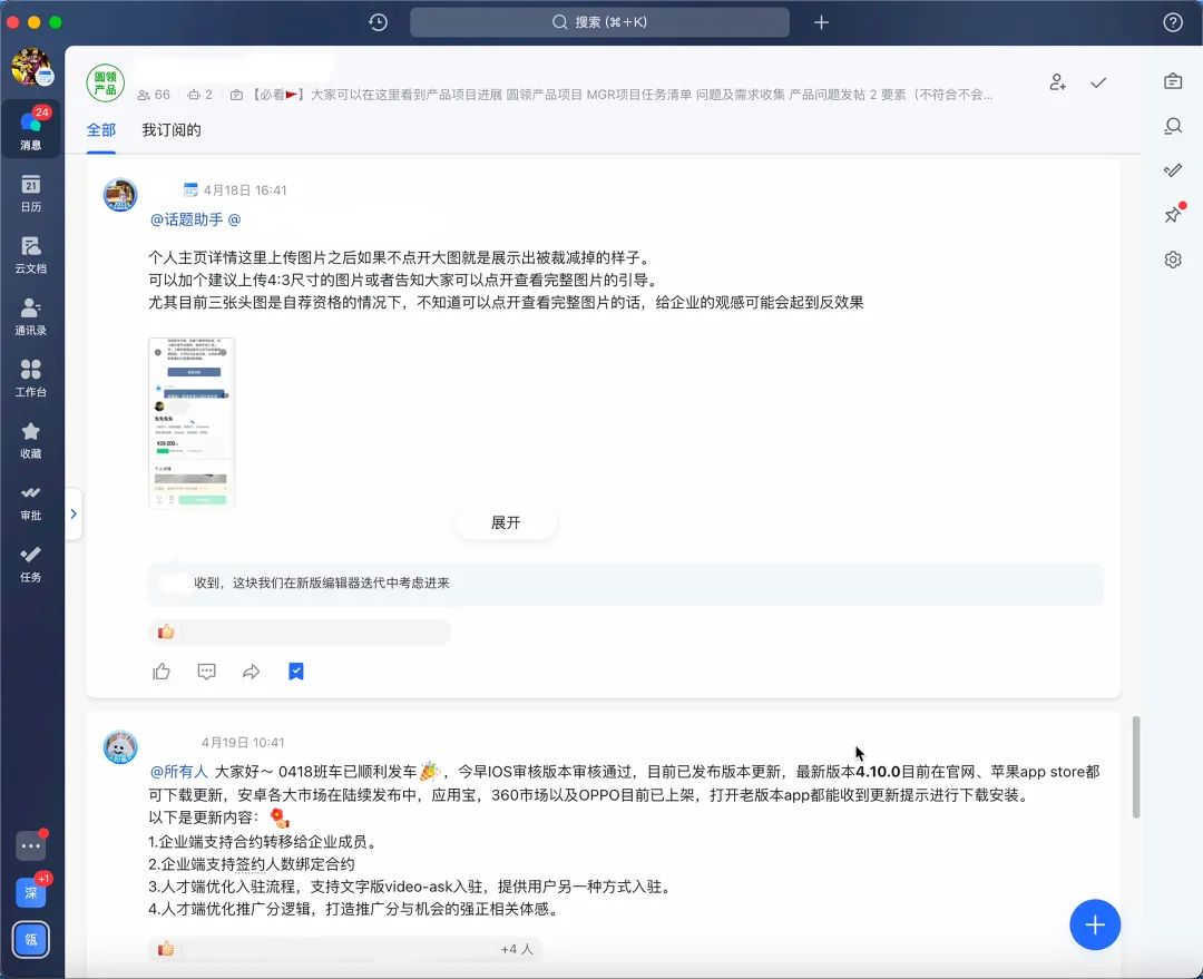 同时,在圆领,并不是每一件事大家用会议来解决,在飞书上,圆领建有多个话题群,如人人都是圆领产品经理,大家经常会抛出遇到的一线用户问题,对产品和业务的想法,可能10分钟内就会收到60条回复,这在Mike看来,这就是一次会议。