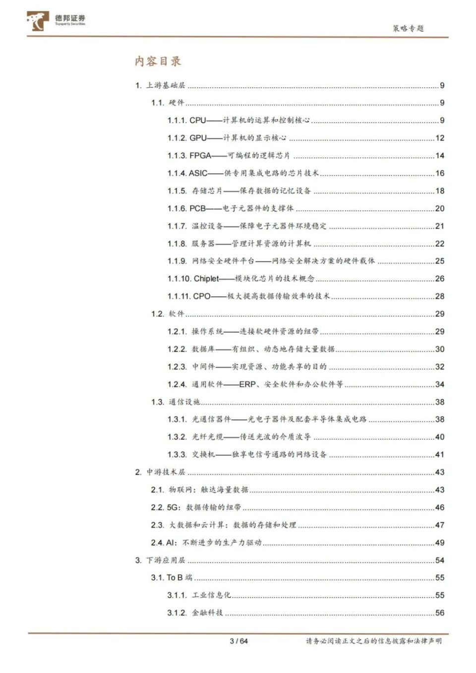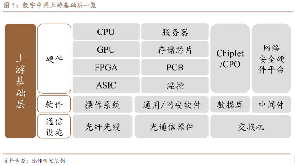 The hardware part mainly includes computing chip (CPU, GPU, FPGA, ASIC), memory chip, PCB, temperature control device, server, network security hardware platform and technical innovation in the field of chip manufacturing (Chiplet, CPO).