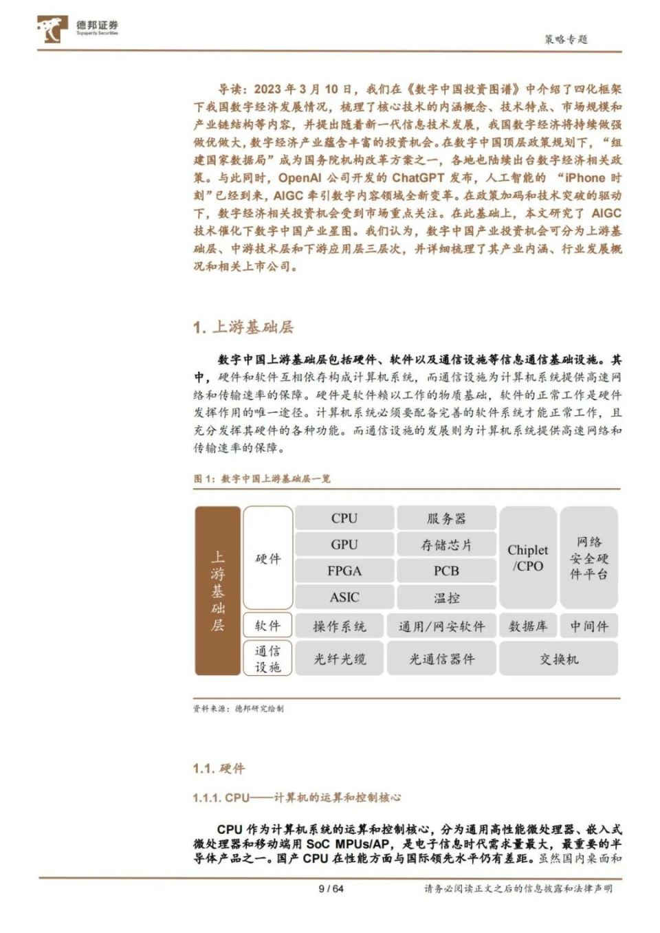 德邦这篇报告详细梳理了数字中国产业链,具体分为上游基础层、中游技术层和下游应用层三层次,并详细梳理了其产业内涵、行业发展概况和相关上市公司。