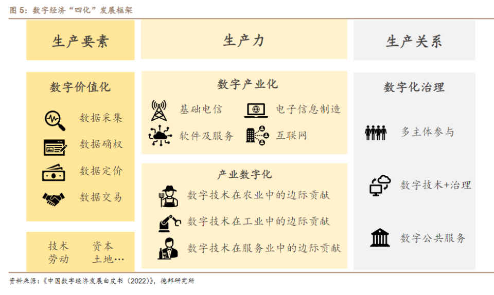 2023 年 3 月 10 日,德邦在《数字中国投资图谱》中介绍了四化框架下我国数字经济发展情况,梳理了核心技术的内涵概念、技术特点、市场规模和产业链结构等内容,并提出随着新一代信息技术发展,我国数字经济将持续做强做优做大,数字经济产业蕴含丰富的投资机会。