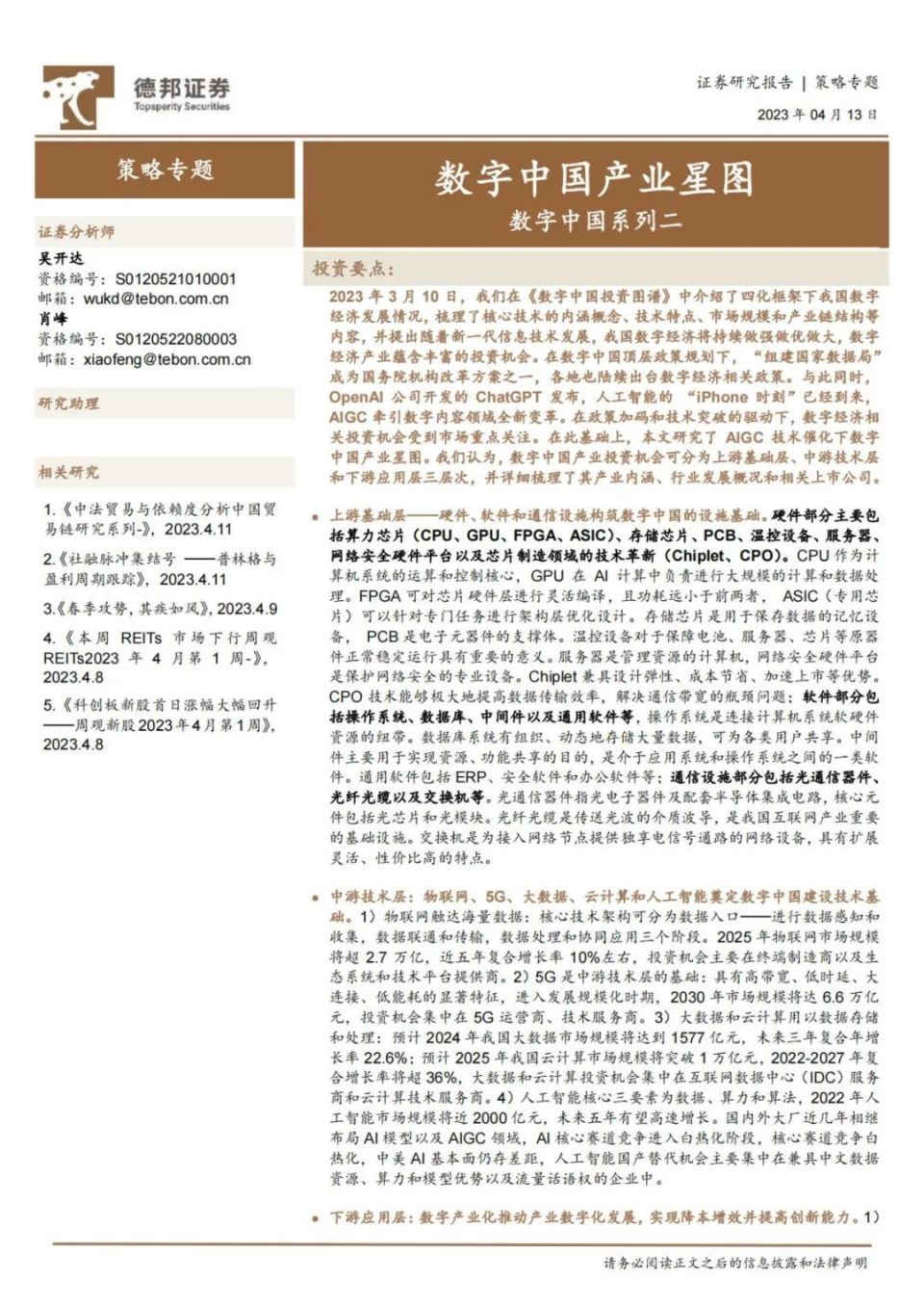 在政策加码和技术突破的驱动下,数字经济相关投资机会受到市场重点关注。在此基础上,本文研究了 AIGC 技术催化下数字中国产业星图。