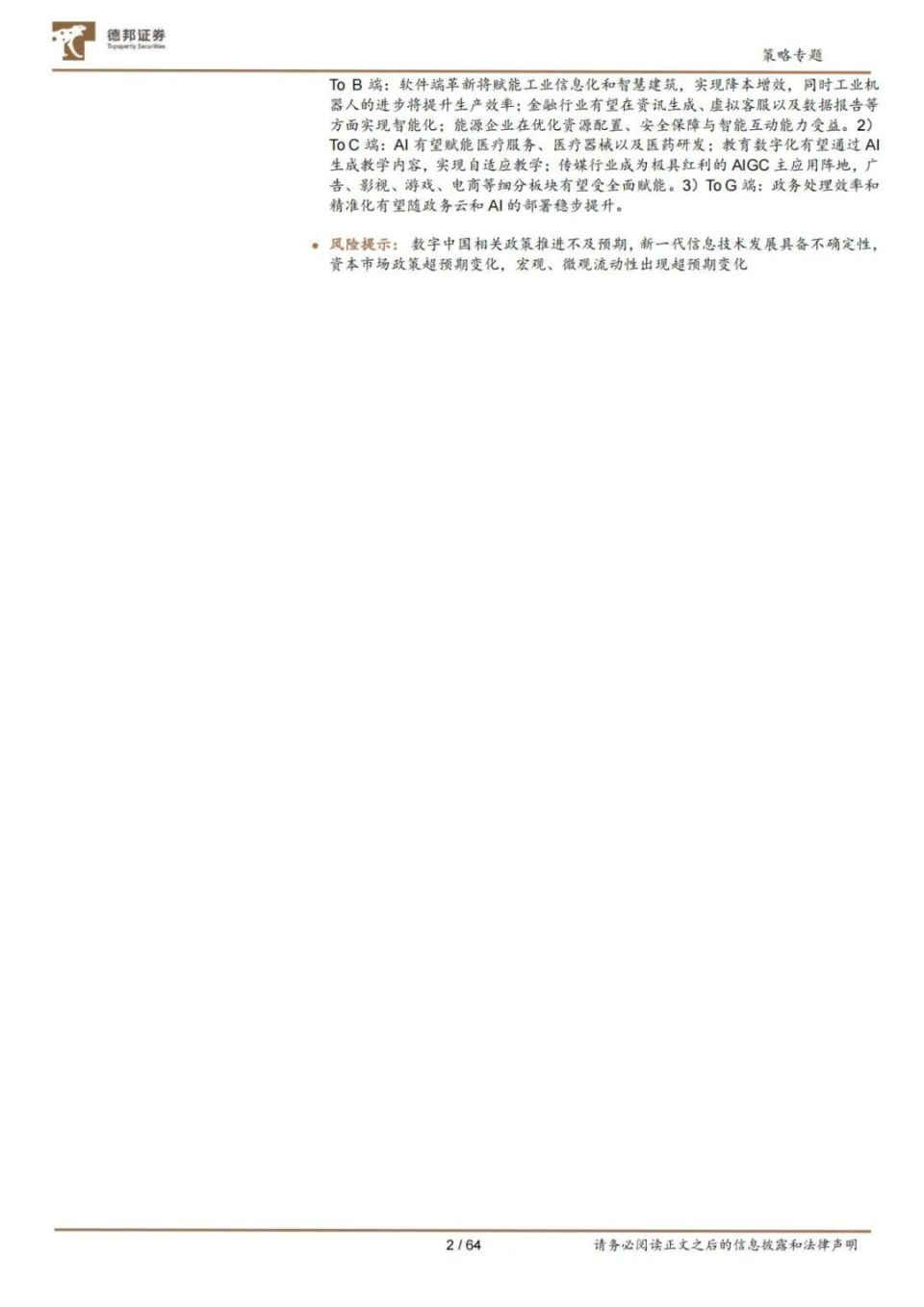 To B 端:软件端革新将赋能工业信息化和智慧建筑,实现降本增效,同时工业机器人的进步将提升生产效率;金融行业有望在资讯生成、虚拟客服以及数据报告等方面实现智能化;能源企业在优化资源配置、安全保障与智能互动能力受益。