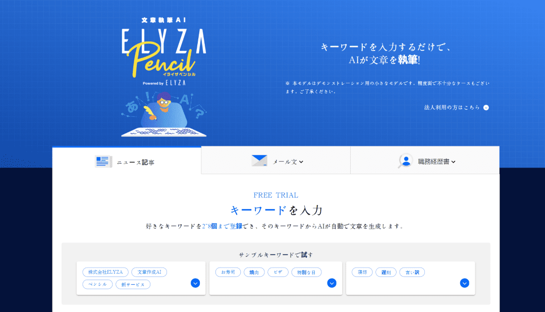 当然,日本也有一些真正土生土长的大模型,比如2022年3月,由东京大学松尾研究所的AI初创公司 ELYZA Co., Ltd.推出大语言模型,它以产品“ELYZA Pencil”的方式推向市场。输入几个关键字,ELYZA Pencil可以在大约 6 秒内创建三种类型的日语新闻报道、电子邮件或简历。