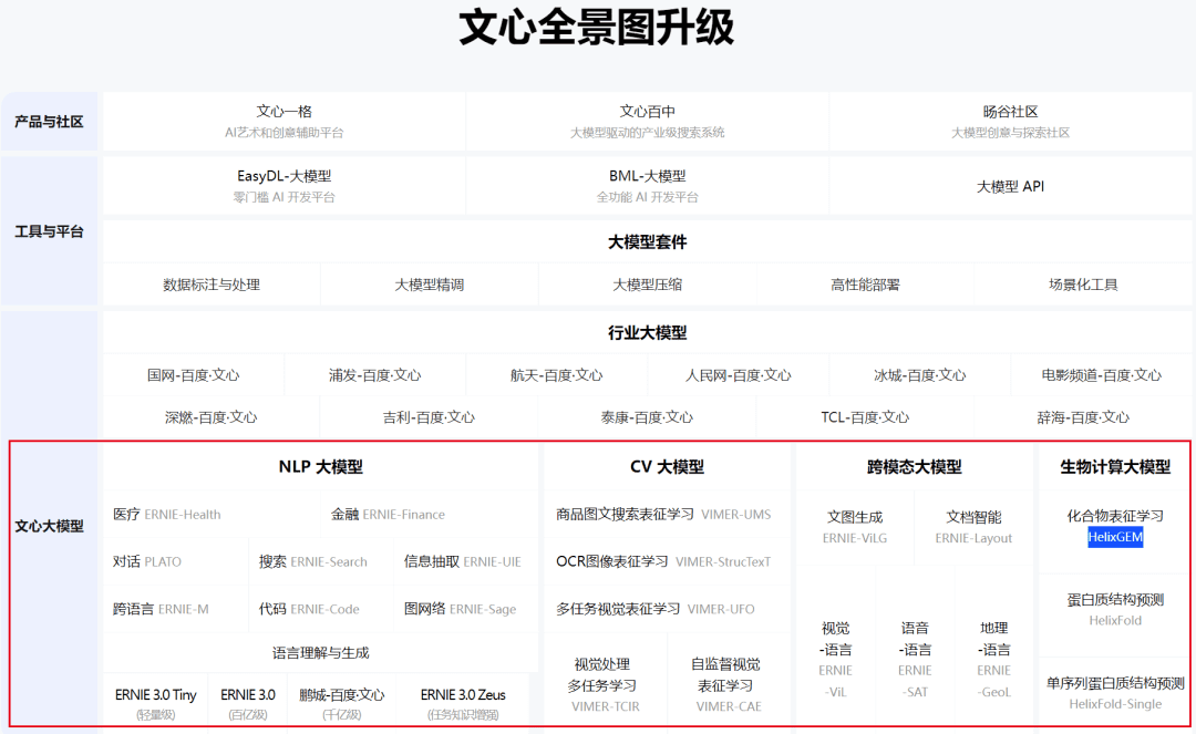 比如百度在2019年发布了文心大模型。和悟道AI一样,文心大模型也是诸多模型的统称,包括NLP、CV(机器学习)、跨模态大模型和生命计算大模型四个类别36个大模型。