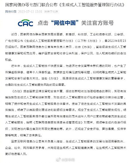 【七部门:推动生成式人工智能基础设施和公共训练数据资源平台建设】财联社7月13日电,国家网信办等七部门联合公布《生成式人工智能服务管理暂行办法》。《办法》提出,鼓励生成式人工智能技术在各行业、各领域的创新应用,生成积极健康、向上向善的优质内容,探索优化应用场景,构建应用生态体系。鼓励生成式人工智能算法、框架、芯片及配套软件平台等基础技术的自主创新,平等互利开展国际交流与合作,参与生成式人工智能相关国际规则制定。推动生成式人工智能基础设施和公共训练数据资源平台建设。促进算力资源协同共享,提升算力资源利用效能。推动公共数据分类分级有序开放,扩展高质量的公共训练数据资源。鼓励采用安全可信的芯片、软件、工具、算力和数据资源。