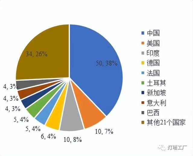 从2018年到2023年1月,全球“灯塔工厂”的数量从9家快速增加至132家,分布在30个国家或地区。按照“灯塔工厂”所在地统计,中国遥遥领先。中国“灯塔工厂”达到50家,占全球总量的37.9%,居全球首位;其次是印度12家、占比9.1%;排名第三的是美国10家、占比7.6%。按照“灯塔工厂”所属企业的国别进行统计,中美并驾齐驱。中国企业建设的“灯塔工厂”共35家,占比27%;美国企业建设“灯塔工厂”共33家,占比25%;德国企业建设的“灯塔工厂”共20家,占比15%。