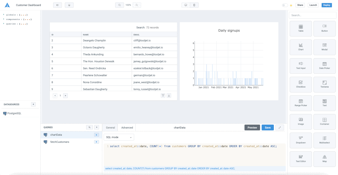 ToolJet 是一个开源的低代码框架,无需工程团队付出太多努力即可快速构建和部署内部工具。你可以连接到你的数据源,例如数据库(如 PostgreSQL、MongoDB、Elasticsearch 等)、API 端点(ToolJet 支持导入 OpenAPI 规范和 OAuth2 授权)和外部服务(如 Stripe、Slack、Google Sheets、Airtable)并使用预先构建的 UI 小部件来构建内部工具。数字化转型网www.szhzxw.cn