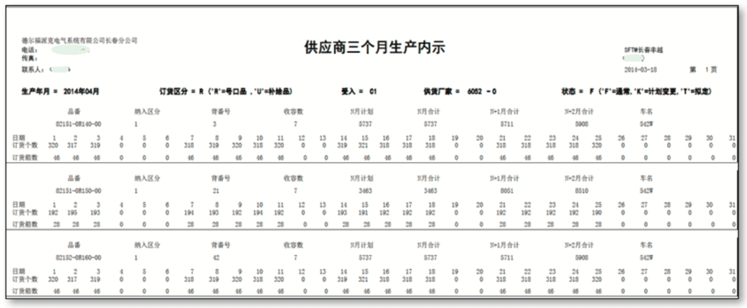 目前,一汽丰田的合资企业还保持着锁定三个月生产周期车型的做法,每月向供应商发送未来三个月的《内示计划》(图4是一汽丰田公司某工厂向供应商发送的某零部件的《内示计划》)。《内示计划》对该供应商生产的每种零部件当月每天的需求数量和下两个月每种零部件的需求总量进行告知,供应商可依此制定生产计划、进行资源准备、组织生产制造和仓储发货等工作。《内示计划》可以反映出制造商在“生产计划锁定期”、“生产平准化”和“生产计划兑现率”等方面的管理水平,也是生产链精益化水平的一个重要标志。