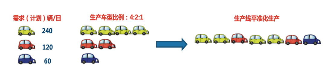 平准化生产分为生产数量平准化和车型排列平准化。生产数量的平准化指的是在编排生产计划时要确保每个工作日内生产的车辆数量相同;车型排列的平准化,指的是生产线一定生产周期内(一小时或更短的时间间隔)生产制造的各种细分车型排布均匀,数量相等(如图5所示)。这样均衡的生产对制造商和供应商而言,可以精确地进行设备、人员、面积等资源配置,避免出现剩余和不足等浪费现象;对物流商而言,平准化的生产可以使外物流(循环取货)的集货卡车处于稳定和较高的积载状态,同时也可以保证内物流的物料配送作业量均衡、稳定,实现人力资源的科学配置和设备能力充分发挥,杜绝“资源闲置”和“作业等待”等浪费的现象发生。中国数字化转型网www.szhzxw.cn