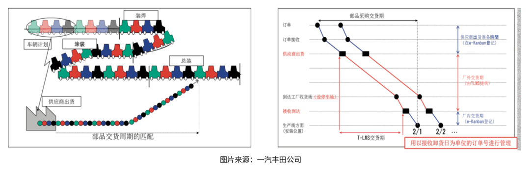 准时化(Just in Time)作业是精益生产链的核心要素之一。在精益生产链体系中,不仅需要供应商的零部件与(虚拟)生产线的车序完美匹配,更需要“抵达时间”精确吻合。图6(左)是一汽丰田供应商零部件出货顺序与生产工厂车序匹配的示意图。通过零部件种类与整车装配需求的高度一致,杜绝了零部件的“欠品”与“溢出”;图6(右)是物流商信息流周期与实物流周期的推移示意图,通过对零部件全过程的时间窗管理,实现不同 “工程深度”(零部件装配工位与总装车间起始工位的距离)零部件的准时化到达,确保了制造商生产过程的“零库存”。需要指出的是,因为物流 “多频次、小批量” 的精益配送方式中整包装零部件数量为最小批量单元,所以在相邻的两次配送之间生产线还是会存放一定数量的零部件。同时,为了应对零部件既存的质量问题和生产装配过程产生的不良品,都需要在生产线侧的部品棚内存放少量的零部件。因此,这里所说的“零库存”是广义的零库存。