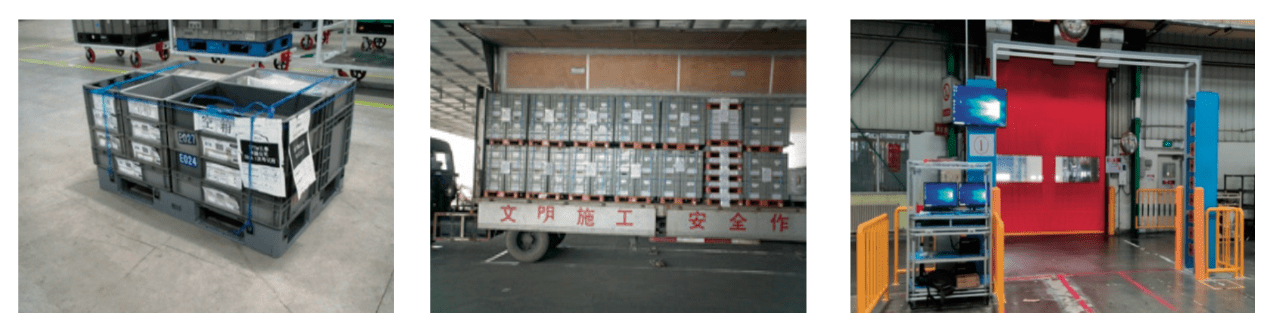 According to the information of the Kanban (box label), the supplier will place the parts packing boxes (EU boxes) of the same order on the top edge of the standard pallet (left of Figure 11, L×W=1000mm×800mm) in alignment (height not exceeding one meter).