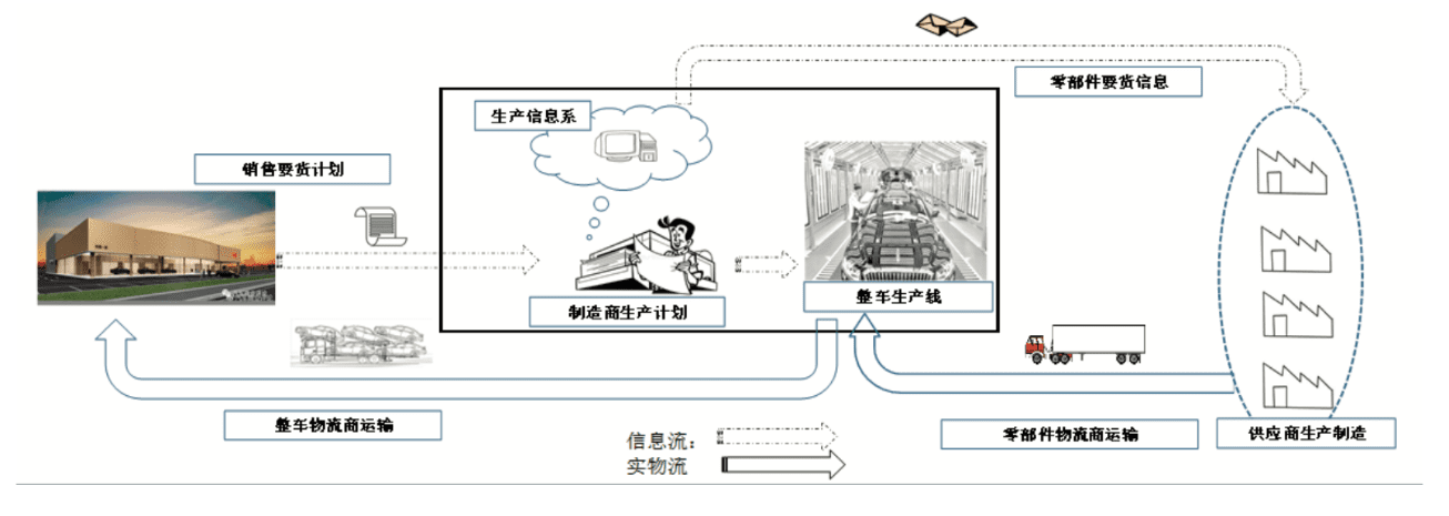 生产链主要包括(零部件)供应商,(整车)制造商和负责生产用物料运输、存储的物流商;