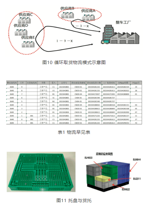 供应商按照看板(箱标签)的信息,将同一订单的零部件包装箱(EU箱)在标准托盘(图11左,L×W=1000mm×800mm)上边缘对齐码放(高度不超过一米),顶层不平齐时用空箱填平,形成便于叠加码放的货托(图11右)。供应商根据制造商的要货信息(收发清单)和早见表进行不同订单的发货准备,物流商(集货卡车司机)根据早见表的指示,按照集货路线和集货时刻顺序依次到集货路线上各供应商装载零部件(同时返回前一个集货循环时产生的空箱),准时运送到整车工厂规定的卸货口,装载需要返回供应商的空箱,开始下一循环的集货作业。考虑到集货卡车的装载效率(也称“积载率”),每一条集货路线都会根据各供应商出货的货量体积,采取“提前集货”的方式对后续一个或几个订单的零部件一并装载,经过生产工厂验收后再按照订单的分割情况进入到不同的P链(如图12所示)。