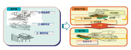 SPS模式是在汽车制造业广为应用的物流方式之一,是典型的牺牲局部精益换取全局精益的案例之一。通过在工厂内择地建设SPS分拣场,根据生产线的车序对个别工位实施顺序对应的零部件配送,实现“空间置换”,解决生产线侧无法安放足够数量部品棚的问题;通过对生产线作业者作业内容实施分离(如图13所示),解决生产节拍内无法完成作业内容的问题;通过零部件选择环境的改变,提高相似零部件选择的精确性,杜绝“错漏装”的质量事故。