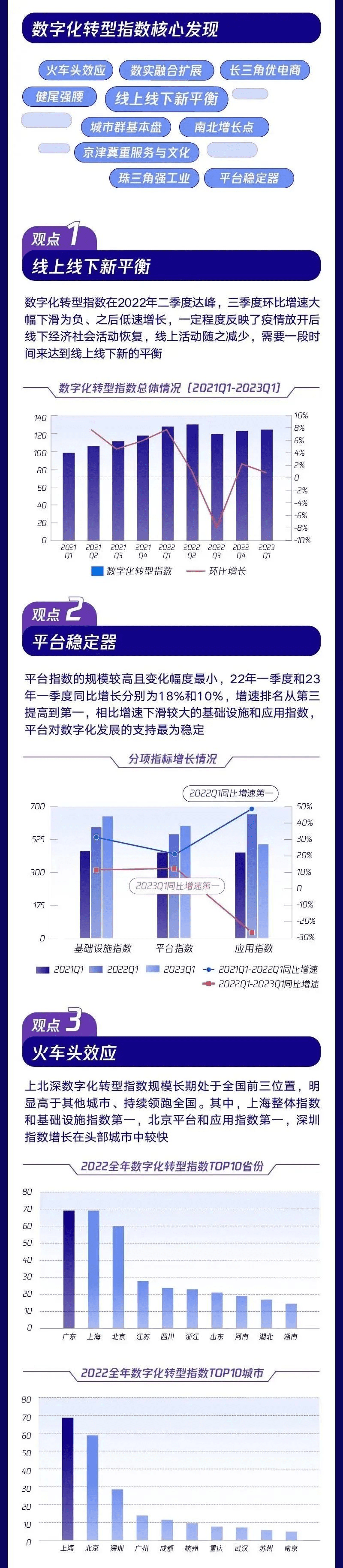 第一部分是数字化转型指数的核心发现。数字技术与实体经济的深度融合发展已成为国家中长期重大战略,数字化转型在经历了几年的加速发展之后,逐渐进入稳定发展期。近2年受新冠疫情影响,国内产业经济发展受到新的考验,在此背景下,各行各业、各地区数字化转型进程受到哪些影响?哪些区域和行业依然呈现出较强的增长动力?