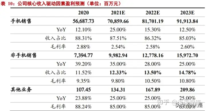 Besides, the gross profit rate of Honor mobile phone is higher than that of Apple. The other major partner of the company. But the gross profit rate of the overall mobile phone sales business is lower. The company is also exploring the space for gross profit growth by providing more related value-added services. Such as carrying out after-sales maintenance network points, etc. And the gross profit rate of mobile phone sales business will increase steadily in 21-23, respectively to 2.54%, 2.58% and 2.60%. At the income end, with the improvement of supply chain issues after the independence of Honor. Its output and sales volume will also increase significantly after the launch of new products. It is estimated that the growth rate of mobile phone sales of the company will be 25%, 15%, 13% compared with the same period last year.