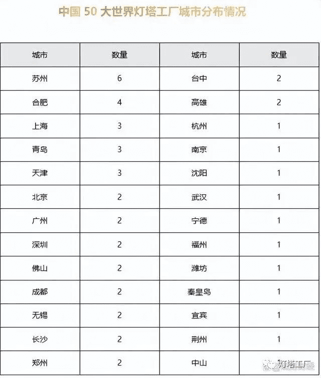 苏州以6家灯塔工厂位居城市之首,合肥以4家位居第二,其他制造强市多是2至3家的数量,较少出现灯塔工厂位于三、四线城市的情况。因在电子产品领域起步较早,我国台湾地区拥有多个该领域的灯塔工厂,富士康在内地的多个厂区也相继入选灯塔工厂。