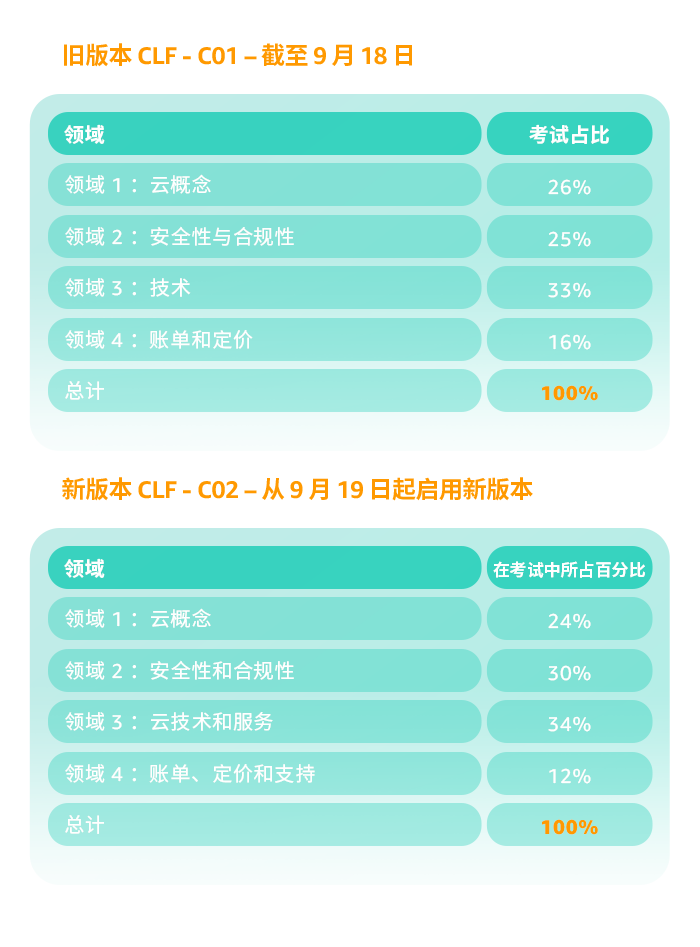 此考试将从 2023 年 9 月 19 日开始变更。参加 AWS Certified Cloud Practitioner(CLF-C01)考试的最后日期是 2023 年 9 月 18 日。
