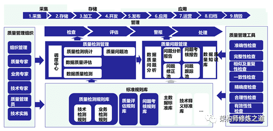 数据质量管理贯穿数据生命周期的全过程,除了明确数据质量管理的策略,还要善于使用数据质量管理的手段及工具,覆盖数据质量需求、数据探查、数据诊断、质量评估、质量提升等方面。