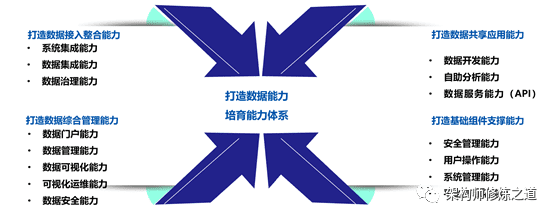 从数据接入整合能力、数据共享应用能力、数据综合管理能力、基础组件支撑能力四方面,全面建设数据能力,培育能力体系,以多类型大数据量的汇聚为基础,以统一模型为标准,为前端应用提供灵活的统一数据服务。