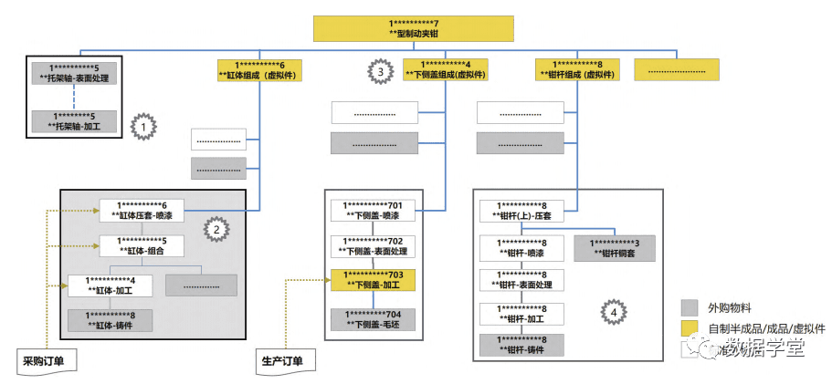 (2)BOM主数据是产品研发的核心,某型制动夹钳BOM示意图如图1所示,BOM不仅是MRP的重要输入数据,同时也是财务部门进行成本核算,制造部门组织生产的重要依据。