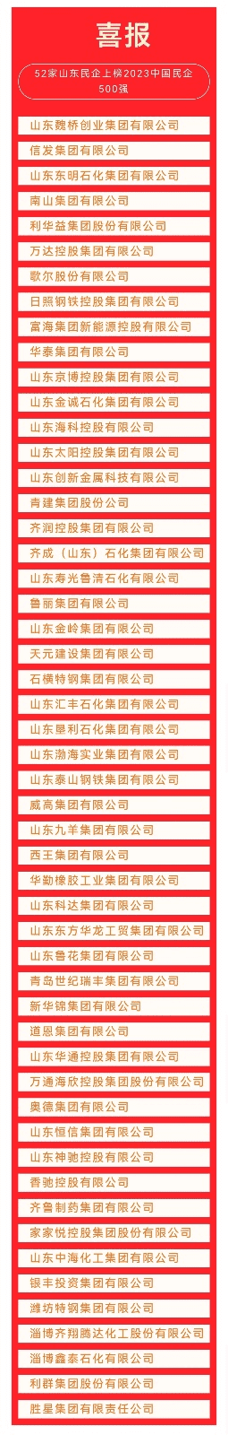 9月12日,2023中国民营企业500强峰会暨全国优强民营企业助力山东绿色低碳高质量发展大会在山东济南召开。会议发布了2023中国民营企业500强,山东有52家民企上榜。其中,山东魏桥创业集团有限公司蝉联榜首,位列第7,信发集团有限公司(第21)、山东东明石化集团有限公司(第58)紧随其后。