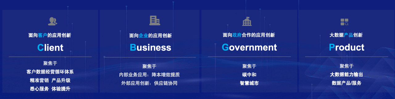 Data application is the landing form of data value. China Resources Land’s data innovation and exploration practice includes ToC, ToB, ToG and ToP. Through continuous production, collection and processing of internal and external data, data assets are formed through identification and storage, and data value is realized through data services or development into data products.